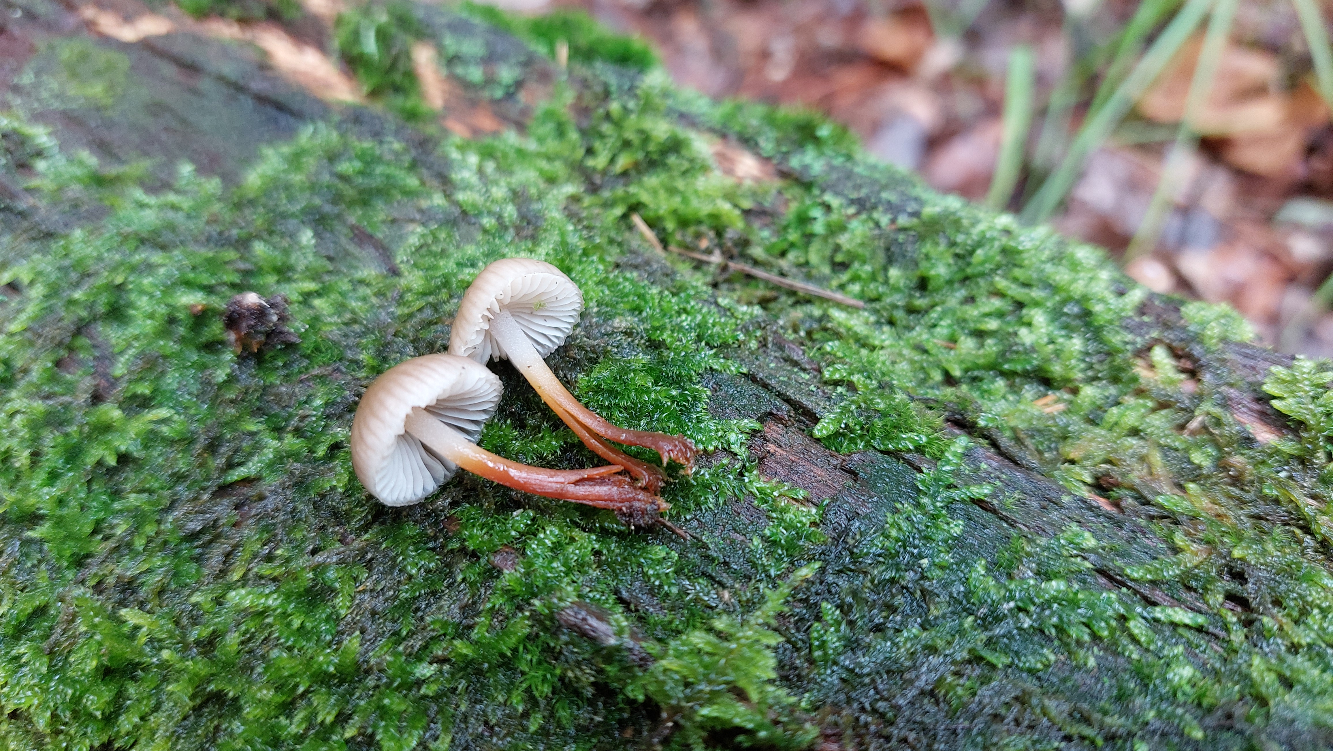 Pilzporträt "Buntstieliger Helmling (Mycena inclinata)"